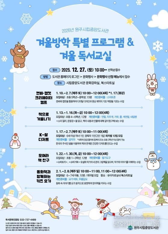 시민행정신문 강갑수 기자 | 원주시립중앙도서관은 겨울방학을 맞아 유아부터 청소년을 대상으로 겨울방학 특별 프로그램과 겨울 독서교실을 운영한다.
