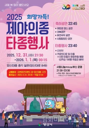 나동연 양산시장은 “2026년은 양산방문의 해이자 시 승격 30주년을 맞이하는 뜻깊은 해로, 이번 제야의 종 타종행사는 시민들과 함께 꽃피운 양산시의 지난 30년을 되돌아보고 새로운 100년을 향한 힘찬 발걸음을 내딛는 의미 있는 자리”라며 “시민 여러분 모두 2025년 한해 마무리 잘하시고 희망찬 새해의 첫 순간을 함께하시길 바란다”고 말했다.