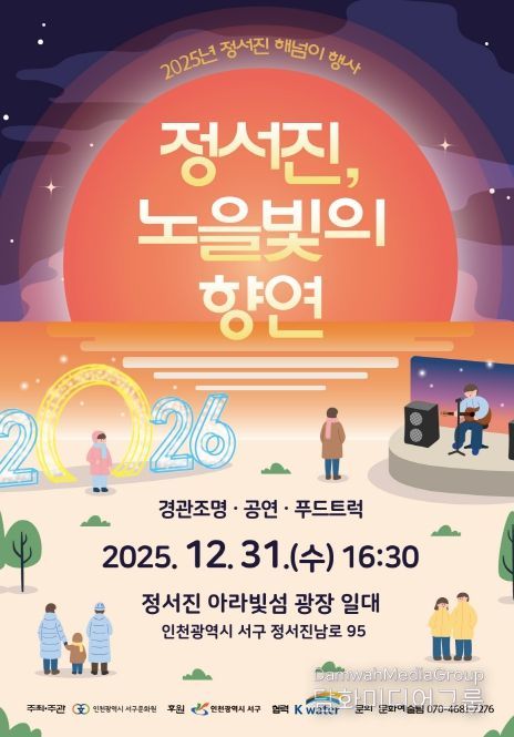 강범석 서구청장은 “우리 구의 대표적인 노을 명소인 정서진을 찾은 구민과 관광객들이 아름다운 노을과 공연을 함께 즐기며 한 해의 마지막 순간을 따뜻하게 기억하시길 바란다”라며 “각자의 바람과 희망을 담아 2026년을 힘차게 시작하는 계기가 되길 기대한다”라고 말했다.