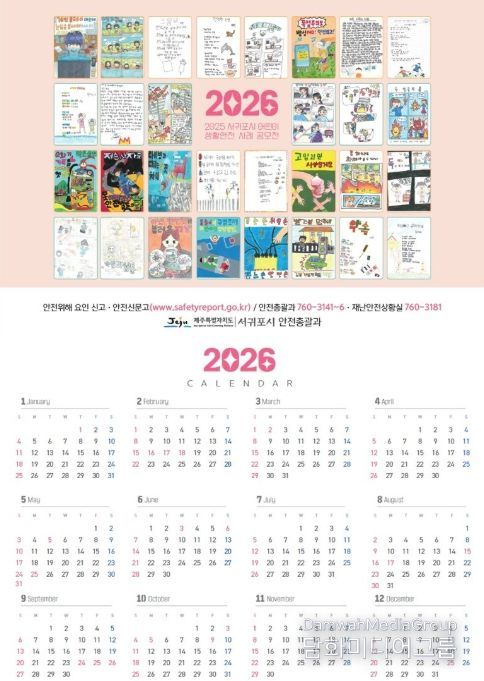 시민행정신문 강갑수 기자 | 서귀포시는 지역사회에 생활 속 안전의식 확산을 위해 2025 어린이 생활안전사례 공모전 수상작 30작품을 활용한 안전문화달력 1,500부를 제작하여 전 부서와 학교, 유관기관에 배부했다고 밝혔다.