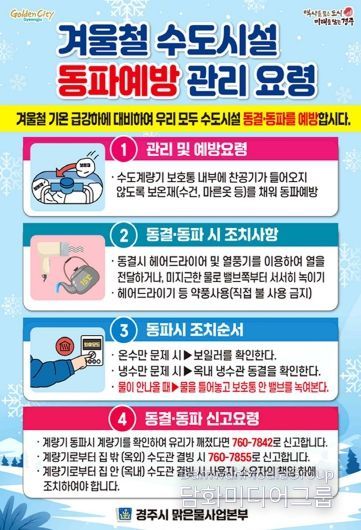 주낙영 경주시장은 “수도시설 동파는 사전 보온 조치만으로도 충분히 예방할 수 있는 만큼, 시민 한 분 한 분의 관심과 실천이 무엇보다 중요하다”며 “시는 현장 대응과 예방 홍보를 강화해 겨울철 수도 이용에 불편이 없도록 최선을 다하겠다”고 말했다.