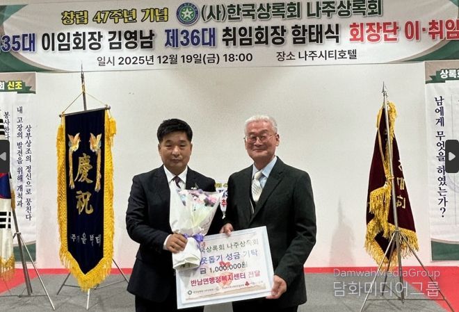 (사)한국상록회 나주상록회 이·취임 회장단(제35대 김영남, 제36대 함태식)은 “창립 47주년을 맞아 지역사회에 따뜻한 마음을 전할 수 있어 뜻깊다”며 “앞으로도 지역과 함께 호흡하며 지속적인 나눔과 봉사를 실천해 나가겠다”고 밝혔다.