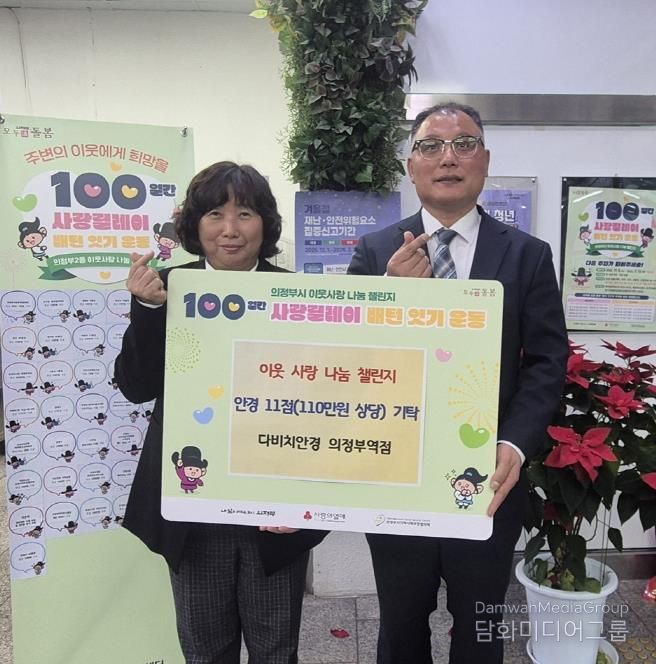 조미경 동장은 “100일간 사랑릴레이에 참여해주신 다비치안경 의정부역점에 진심으로 감사드린다”며 “이번 지원이 취약계층의 시력 개선과 생활 안정에 큰 도움이 될 것으로 기대된다”고 말했다.