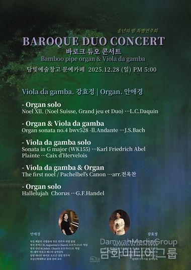 시민행정신문 강갑수 기자 | 담양군문화재단은 오는 28일 오후 5시 담빛예술창고 문예카페에서 『2025 담빛예술창고 송년특별연주회 ‘바로크 듀오 콘서트’』를 진행한다고 밝혔다.
