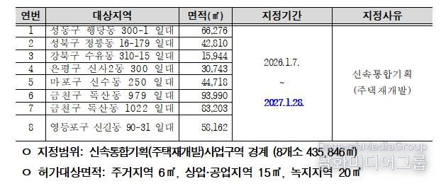 신규 지정 대상은 성동구 1곳, 성북구 1곳, 강북구 1곳, 은평구 1곳, 마포구 1곳, 금천구 2곳, 영등포구 1곳으로 총 8개 구역이다. 성동구 행당동 300-1 일대 외 7곳(총435,846㎡)이며, 효율적인 구역 관리를 위해 기존 신속통합기획 주택재개발 선정 구역과 동일한 만료 기간으로 설정했다.