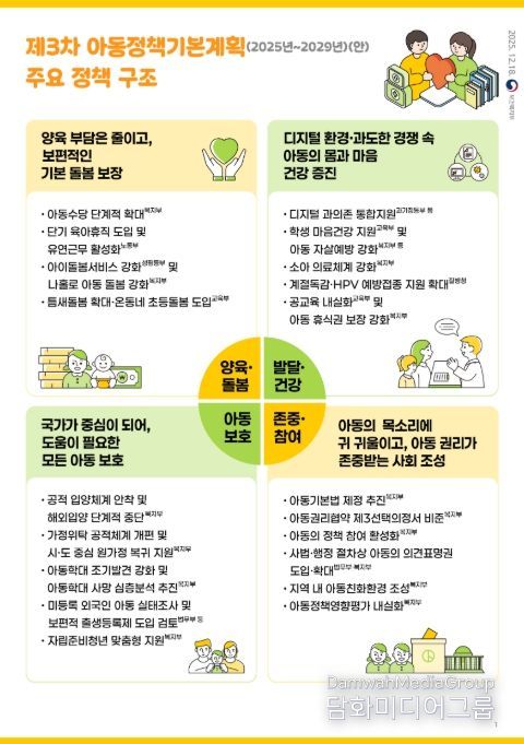 시민행정신문 이존영 기자 | 정부는 아동정책조정위원회 심의·의결을 거쳐 “모든 아동이 건강하고 행복한 기본사회 실현”을 지향점으로 하는 '제3차 아동정책기본계획(2025~2029)'을 확정·발표했다.