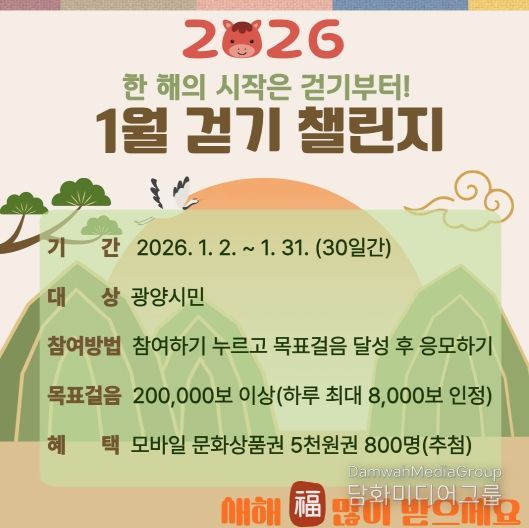 반미순 건강증진과장은 “새해 건강은 매일의 꾸준한 실천에서 시작된다”며 “1월 걷기 챌린지를 통해 새해부터 한 걸음씩 건강한 생활을 실천하길 바란다”고 말했다.