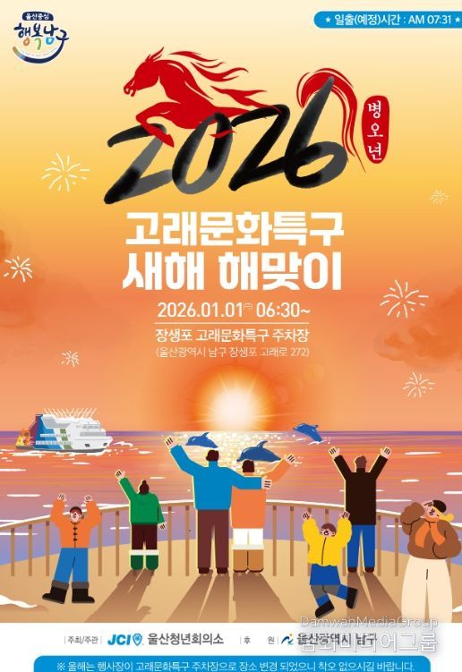 서동욱 남구청장은 “2026년 해맞이 행사는 장소 변경과 프로그램 보강을 통해 한층 새로워진 모습으로 준비했다”며 “장생포 고래문화특구에서 가족과 이웃이 함께 새해의 희망을 나누는 뜻깊은 시간이 되기를 바란다”고 말했다.