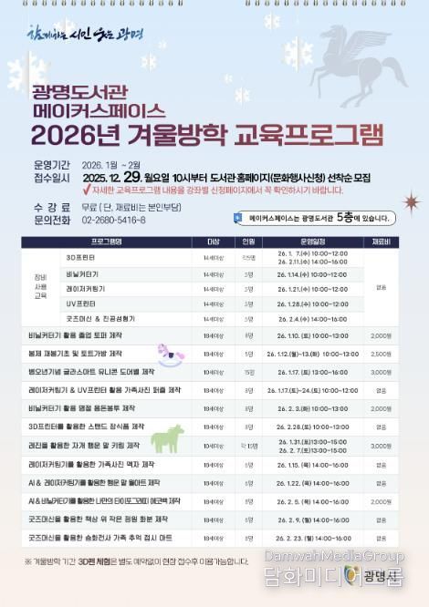 시민행정신문 강갑수 기자 | 광명시 광명도서관은 오는 29일부터 ‘메이커스페이스 2026년 겨울방학 교육 프로그램’ 참가자를 모집한다.