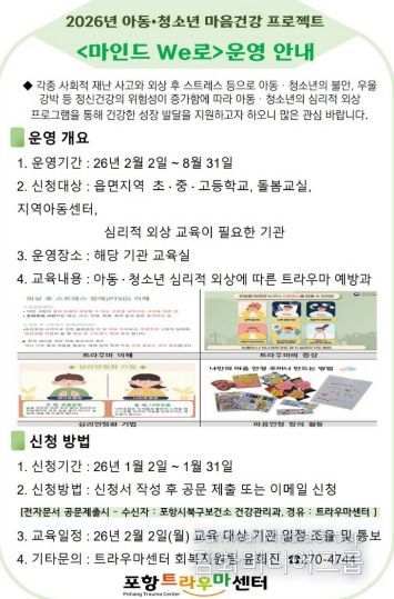 시민행정신문 기자 | 포항시 북구보건소 트라우마센터가 공공 서비스 접근성이 낮은 읍면지역의 학교와 지역아동센터를 대상으로 재난 심리교육 프로그램 ‘마인드 We로’를 운영한다.
