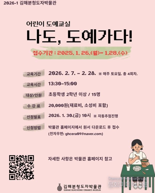 시민행정신문 강갑수 기자 | 김해분청도자박물관은 겨울방학을 맞아 초등학생(2학년~6학년)을 대상으로 한 도예 체험 교육프로그램 '어린이도예교실-나도, 도예가다!' 의 교육생을 모집한다고 밝혔다.