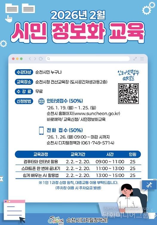 시민행정신문 강갑수 기자 | 순천시는 디지털 기기 사용에 어려움을 느끼는 시민들이 일상생활에서 겪는 불편을 해소할 수 있도록 ‘2026년 정보화 교육’ 수강생을 오는 19일부터 모집한다고 밝혔다.
