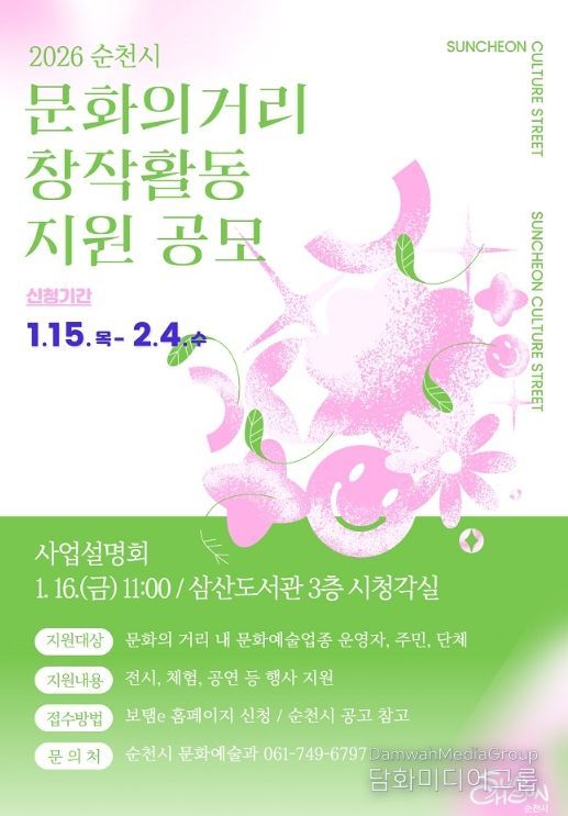 시민행정신문 강갑수 기자 | 순천시는 문화의 거리를 예술특화 거점지역으로 육성하고 지역 예술인의 지속가능한 창작활동을 지원하기 위해 ‘2026년 순천시 문화의 거리 창작활동 지원사업’ 참여자를 공개 모집한다고 밝혔다.