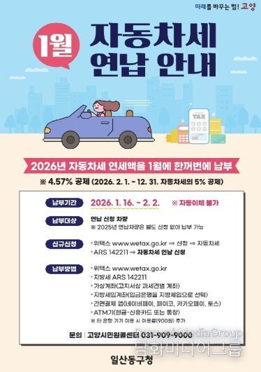 시민행정신문 강갑수 기자 | 고양특례시 일산동구 세무과는 1월에 자동차세를 연납하면 1년 세액의 약 4.5%를 공제받을 수 있는 연납 신청기간을 1월 한 달간 운영한다고 밝혔다.
