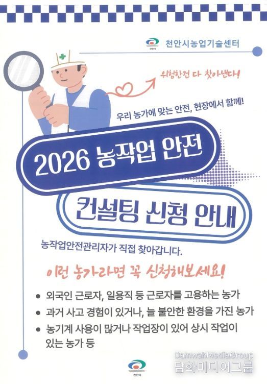 시민행정신문 이세훈 기자 | 천안시농업기술센터는 오는 3월까지 ‘농작업 안전컨설팅’ 참여 농가를 모집한다고 16일 밝혔다.
