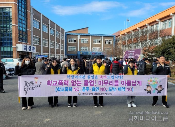행사는 졸업식 당일 학교 정문과 진입로 등 청소년 밀집지역을 중심으로 진행되며, 청소년 폭력 및 비행 예방 캠페인과 함께 완주경찰서와 합동 순찰을 병행해 현장 중심의 예방 활동을 강화했다.