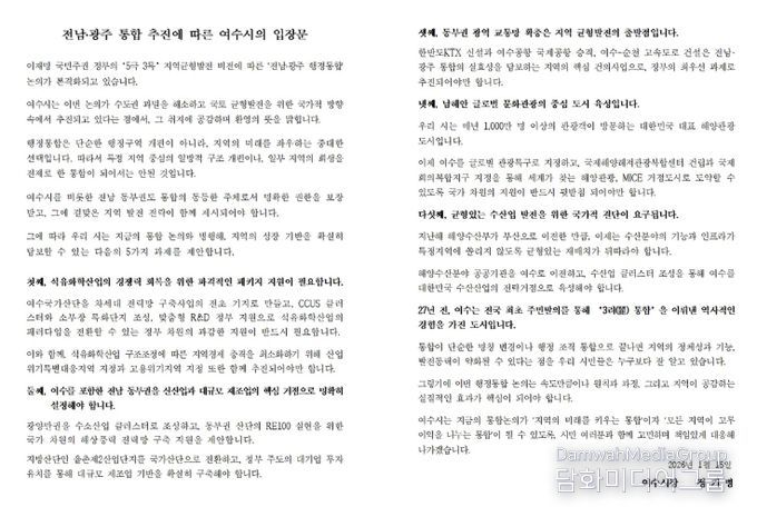 정기명 여수시장은 “여수는 과거 전국 최초로 주민발의를 통한 ‘3려 통합’을 이뤄낸 자치 분권의 상징적 도시”라며 “이번 행정통합이 여수의 정체성을 지키면서도 새로운 도약의 기회가 될 수 있도록 시민들과 함께 치밀하게 대응해 나가겠다”라고 밝혔다.