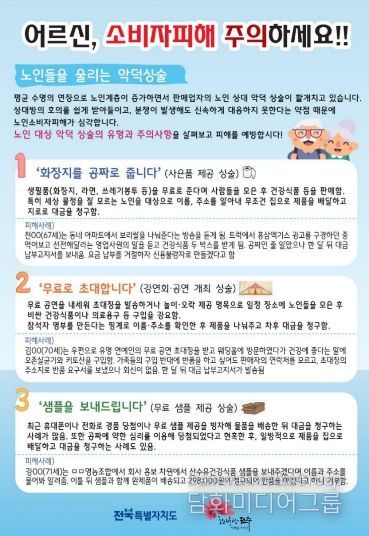 시민행정신문 강갑수 기자 | 최근 생필품 염가 판매나 무료 사은품 제공을 앞세워 소비자를 유인한 뒤 고가의 건강보조식품이나 전자제품 등을 판매하는 사례가 늘고 있는 가운데, 전주시가 피해 예방을 위해 주의해 줄 것을 당부했다.