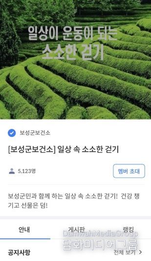 군 관계자는 “모바일 걷기 챌린지는 군민들이 일상에서 건강을 관리할 수 있는 실천 프로그램”이라며 “앞으로도 연령과 생활환경을 고려한 맞춤형 건강 증진 사업을 확대해 군민 삶의 질 향상에 기여하겠다”라고 전했다.