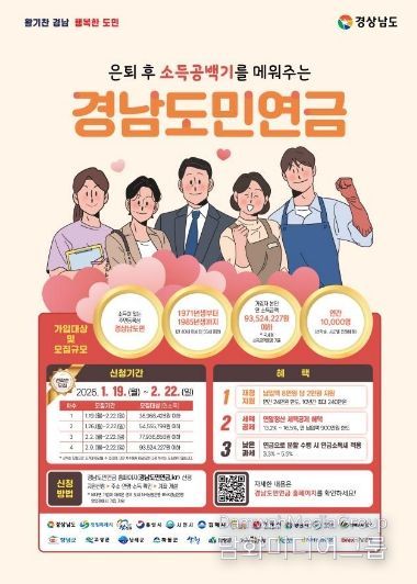 시민행정신문 강갑수 기자 | 함양군은 군민의 은퇴(60세) 이후 공적연금 수령 전(65세)까지의 소득 공백기를 대비하고 안정적인 노후 준비를 지원하기 위해 '2026년 경남도민연금 지원사업'을 추진하고 가입자를 모집한다고 밝혔다.