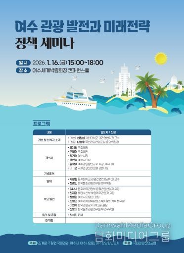 한편 이번 정책 세미나는 여수 관광의 미래 전략을 논의하기 위해 마련된 자리로, 주철현 의원, 여수시, 여수시의회, 여수광양항만공사와 함께 주최하고, 국회관광산업포럼과 공동 주관해 열렸다.