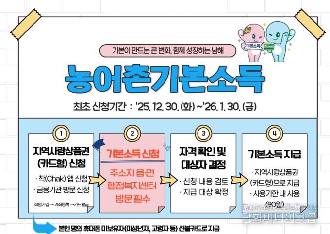 남해군 관계자는 “농어촌 기본소득은 읍·면 행정복지센터 방문 신청이 원칙”이라며 “신청 기간 내 반드시 직접 방문해 신청 절차를 완료해야 최초 지급분을 받을 수 있다”고 말했다.
