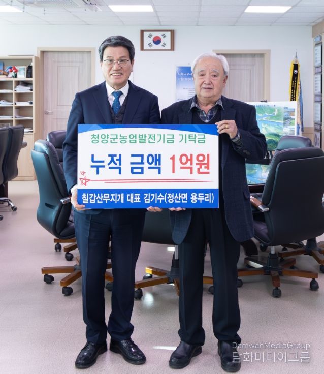 시민행정신문 강갑수 기자 | 청양군은 정산면 용두리 소재 ‘칠갑산무지개’의 김기수 대표가 군청을 방문해 농업발전기금 1,000만 원을 기탁하면서 올해로 마침내 누적 기탁금 1억 원을 달성했다고 밝혔다.