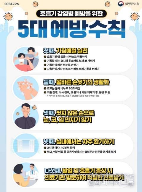 호흡기 감염병의 발생과 전파 예방을 위해서는 △ 접종 시기에 맞춰 예방접종 실시 △ 흐르는 물에 30초 이상 올바른 손씻기 △ 기침할 때 옷소매로 입과 코 가리기 △ 실내에서 자주 환기하기 △ 증상 발생 시 의료기관 방문해 진료받기 등 예방수칙을 준수하는 것이 중요하다.
