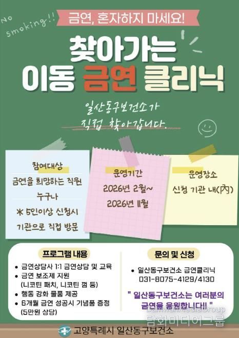 시민행정신문 기자 | 고양특례시 일산동구보건소는 보건소 방문이 어려운 직장인 흡연자를 대상으로 ‘찾아가는 금연클리닉’을 운영한다고 19일 밝혔다.