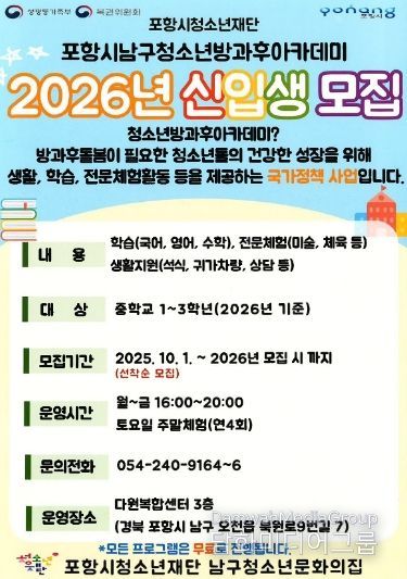 시민행정신문 기자 | 포항시청소년재단 남구 청소년방과후아카데미는 오는 31일까지 2026년 신입생을 모집한다.