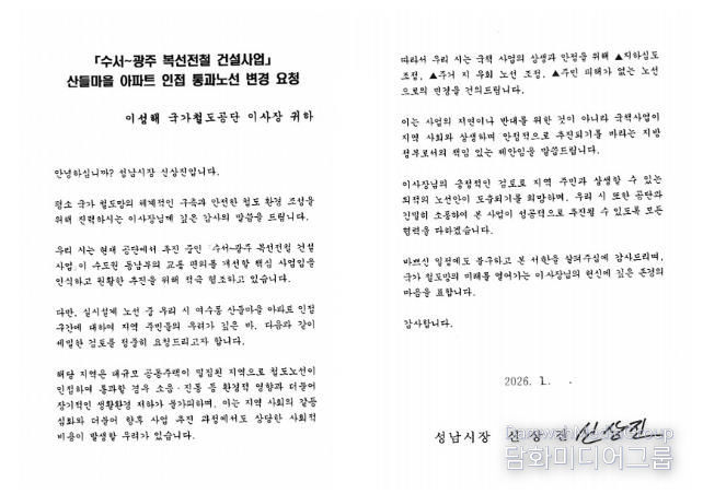 시민행정신문 강갑수 기자 | 성남시는 지난 16일 김윤덕 국토교통부 장관과 이성해 국가철도공단 이사장에게 ‘수서~광주 복선전철(이하 수광선) 건설사업’과 관련하여 여수동 산들마을 아파트 인접 통과 구간의 노선 변경을 요청하는 서한을 전달했다고 20일 밝혔다.