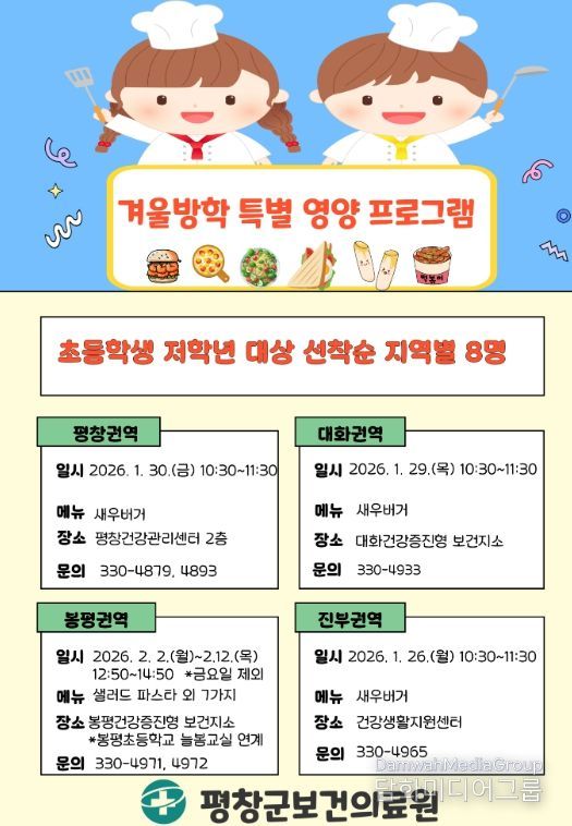 시민행정신문 기자 | 평창군보건의료원은 1월 26일부터 2월 12일까지 4개 지역(평창읍, 대화면, 봉평면, 진부면)에서 초등학생 대상으로 '겨울방학 특별 영양 프로그램'을 운영한다고 밝혔다.