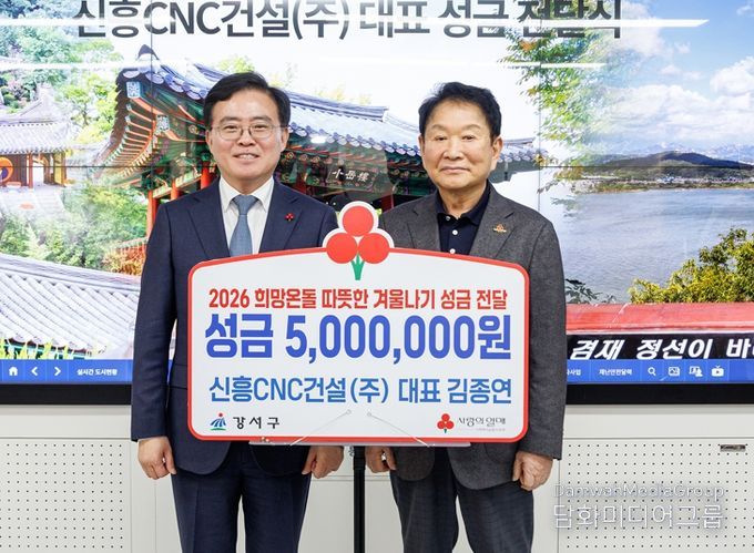 구는 26일 월요일 김종연 신흥CNC건설 대표로부터 이웃돕기 성금 5백만 원을 전달받았다. 김 대표는 지난 2019년도부터 따뜻한 나눔을 실천해 왔다. 현재까지 누적 성금은 6천6백만 원으로, 강서구 기부자 명예의 전당에도 헌액된 바 있다.