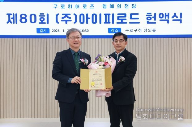 이날 장 구청장은 구청 창의홀에서 ㈜아이피로드(대표 강철지)에게 사회공헌 인증서를 전달하고, 본관 1층 명예의 전당에 제80호 구로히어로즈 명패를 등재했다.