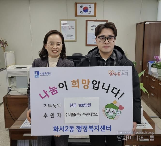 시민행정신문 강갑수 기자 | 수원시 팔달구 화서2동에 위치한 수비올㈜ 수원사업소는 설 명절을 앞두고 지난 26일 화서2동 행정복지센터를 방문해 지역 내 어려운 이웃을 돕기 위한 이웃돕기 성금 100만 원을 기탁했다.