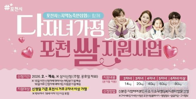 협약에 따라 포천시에 주민등록을 둔 2자녀 이상 가정(막내 자녀 18세 이하)을 대상으로 자녀 수에 따라 차등된 물량의 ‘포천 쌀’을 분기별로 지원한다. 다만 초중고·대학교·기숙사 등 학업을 목적으로 세대 분리된 자녀의 경우에도 지원 대상에 포함된다. 지원 규모는 2자녀 가정 14kg, 3자녀 가정 20kg, 4자녀 가정 40kg, 5자녀 가정 60kg, 6자녀 이상 가정 80kg으로, 매년 3·6·9·12월에 각 가정으로 배송된다.