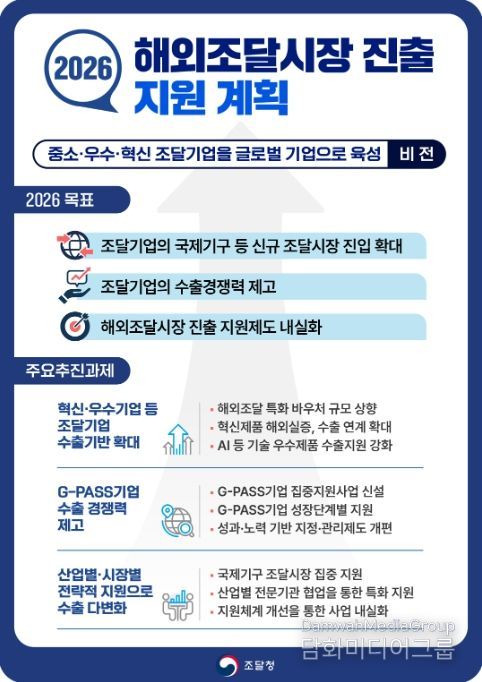 시민행정신문 이세훈 기자 | 조달청은 중소 혁신·기술우수 조달 기업들이 글로벌 기업으로 도약할 수 있도록 '2026년 해외조달시장 진출 지원계획'을 확정하여, 해외조달시장 진출을 위한 지원을 대폭 강화한다고 밝혔다.