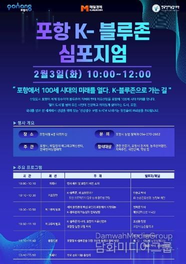 시민행정신문 강갑수 기자 | 포항시는 내달 3일부터 시청 대회의실에서 ‘포항에서 100세 시대의 미래를 열다, K-블루존으로 가는 길’ 심포지엄을 개최한다.
