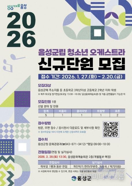 오디션은 2월 28일 오후 1시 30분 음성문화예술회관에서 진행되며, 무반주 자유곡 연주와 면접을 통해 최종 단원을 선발한다. 합격자는 오는 3월 4일 음성군청 홈페이지를 통해 발표될 예정이다.