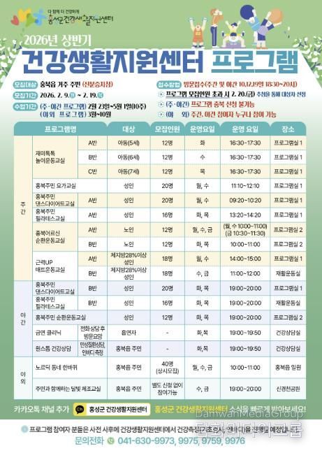 정영림 홍성군보건소장은 “참여자들이 다양한 신체활동을 통해 나만의 건강목표를 세우고 달성하는 의미 있는 시간이 되기를 바란다”며, “앞으로도 지역주민 의견을 반영해 건강관리에 대한 관심을 높일 수 있는 다채로운 프로그램을 개발·운영하겠다”고 밝혔다.
