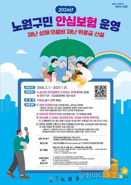 오승록 노원구청장은 “구에서 지원하는 보험이 일상생활 중 예상치 못한 피해를 입은 구민들에게 든든한 보호막이 되어주기를 바란다”며, “불의의 사고를 빠르게 극복하여 일상을 회복할 수 있도록 다양한 안전 인프라를 확충하겠다”고 말했다.