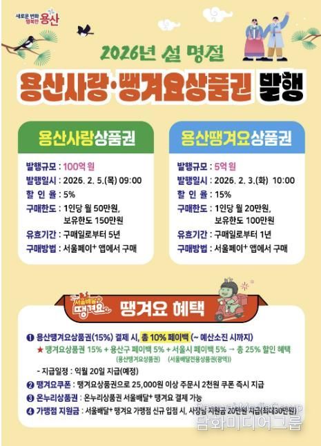 시민행정신문 강갑수 기자 | 서울 용산구가 2026년 설 명절을 맞아 구민의 소비 부담을 줄이고 지역경제를 활성화하기 위해 총 105억 원 규모의 ‘용산사랑상품권(100억)’과 ‘용산땡겨요상품권(5억)’을 발행한다.