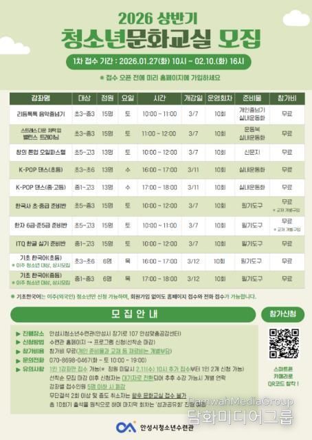 시민행정신문 강갑수 기자 | 안성시청소년수련관이 지역 청소년들의 건강한 여가 선용과 자기계발을 위해 1월 27일부터 2월 10일까지 ‘청소년 문화교실’ 수강생을 모집한다.
