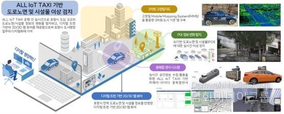 교통량이 많은 택시와 관용차량 지붕에 IoT 센서와 카메라를 설치해, 차량이 도로를 주행하는 과정에서 포트홀(도로 파임), 차선 훼손, 불법 적치물, 어린이보호구역 내 불법 주정차 등을 자동으로 감지한다.