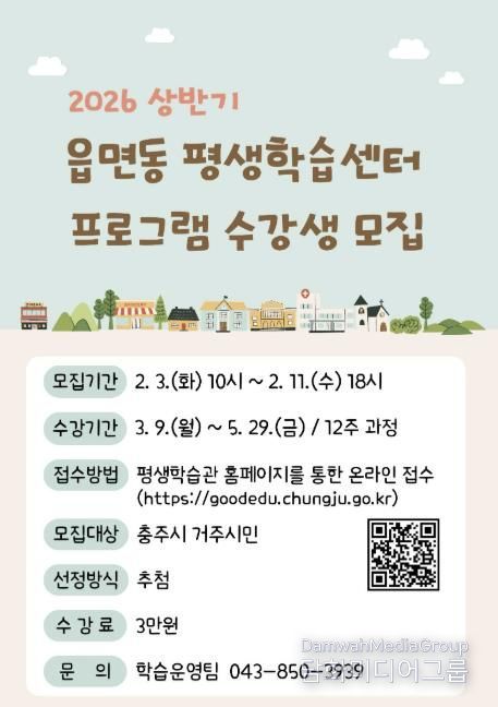 시민행정신문 강갑수 기자 | 충주시 평생학습관은 시민 누구나 거주지 인근에서 배움의 기회를 누릴 수 있도록 2026년 상반기 읍면동 평생학습센터 프로그램 수강생을 모집한다고 30일 밝혔다.