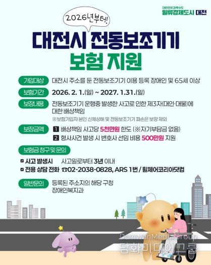 시민행정신문 기자 | 대전시는 전동휠체어 및 전동스쿠터 이용 장애인의 안전하고 자유로운 이동을 위해, 2026년 2월 1일부터‘전국 최고 수준'의 전동보조기기 보험을 전면 시행하고, 5개 자치구 통합형 제도로 운영해 사고 배상부터 법적 분쟁 지원까지 폭넓은 안전망을 구축할 방침이다.