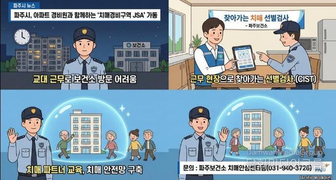 시민행정신문 기자 | 파주시는 오는 2월부터 관내 아파트 단지 경비원을 대상으로 찾아가는 치매 조기 검진 및 예방 프로그램인 ‘치매경비구역 제이에스에이(JSA)’사업을 본격 추진한다고 밝혔다.