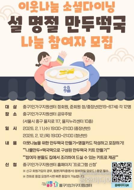 시민행정신문 강갑수 기자 | 서울 중구는 설 명절을 앞두고 오는 4일부터 14일까지 중구1인가구지원센터에서‘설맞이 특별 프로그램’을 운영한다.