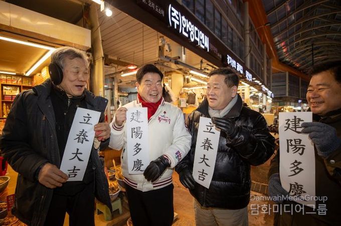특히 이번 일정은 4일 ‘입춘’을 앞두고 진행돼 분위기가 남달랐다. 입춘은 24절기 가운데 첫 절기로 ‘봄의 시작’을 알리는 날로, 예로부터 대문에 ‘입춘첩’을 붙이며 한 해의 복을 기원해 왔다. 이 구청장과 상인들은 ‘입춘대길 건양다경(立春大吉 建陽多慶)’이라 적힌 종이를 함께 들어 보이며 환하게 웃는 사진을 남기기도 했다. 이 문구는 입춘에 많이 쓰이는 글귀로 “봄이 드니 크게 길하고, 좋은 경사가 많기를 바란다”는 뜻을 담는다. 구는 “설을 앞둔 시장의 분주함과 입춘이 상징하는 새출발의 기운이 맞물려, 주민과 상인 모두에게 작은 희망이 되길 바라는 마음”이라고 전했다.