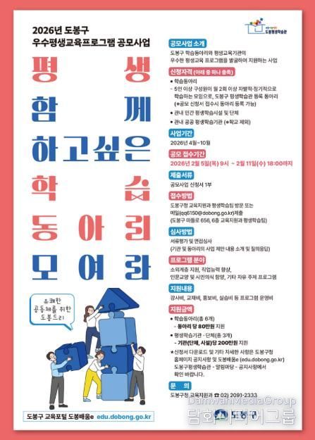 오언석 도봉구청장은 “이번 공모로 주민이 주도하는 학습 활동이 더욱 활성화되고, 지역과 함께 성장하는 평생학습 문화가 자리 잡기를 기대한다.”라고 말했다.